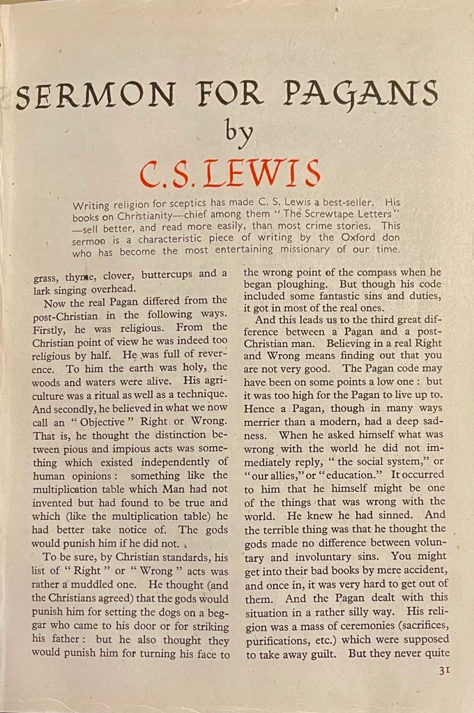 In 1946, C.S. Lewis wrote “A Christmas Sermon For Pagans” in Strand Magazine (Strand magazine, Vol. 112, Issue 672, December 1946). However, it was forgotten for decades until Stephanie Derrick discovered it in 2017 while preparing to do research for her PhD at the University of Stirling on Lewis’ international reception. Here is the full essay (you may find scanned images of the essay at end!):