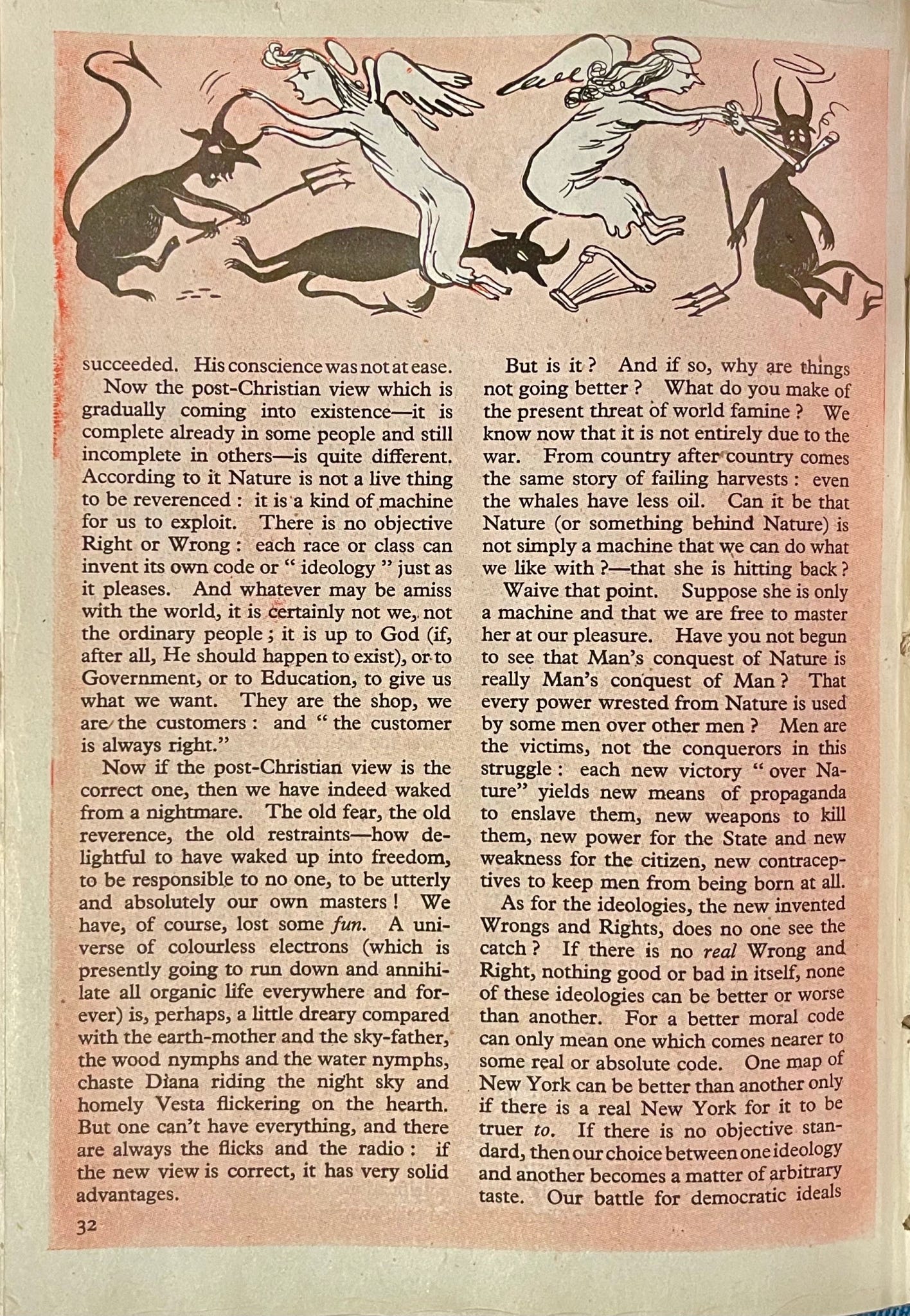 Now if the post-Christian view is the correct one then we have indeed woken from a nightmare. The old fear, the old reverence, the old restraints... how delightful to have woken up into freedom, to be responsible to no one, to be utterly and absolutely our own masters! We have, of course, lost some fun. A universe of colourless electrons (which is presently going to run down and annihilate all organic life everywhere and forever) is, perhaps, a little dreary compared with the earth-mother and the sky-father, the wood nymphs and the water nymphs, chaste Diana riding the night sky and homely Vesta flickering on the hearth. But one can’t have everything, and there are always the flicks and the radio: if the new view is correct, it has very solid advantages.