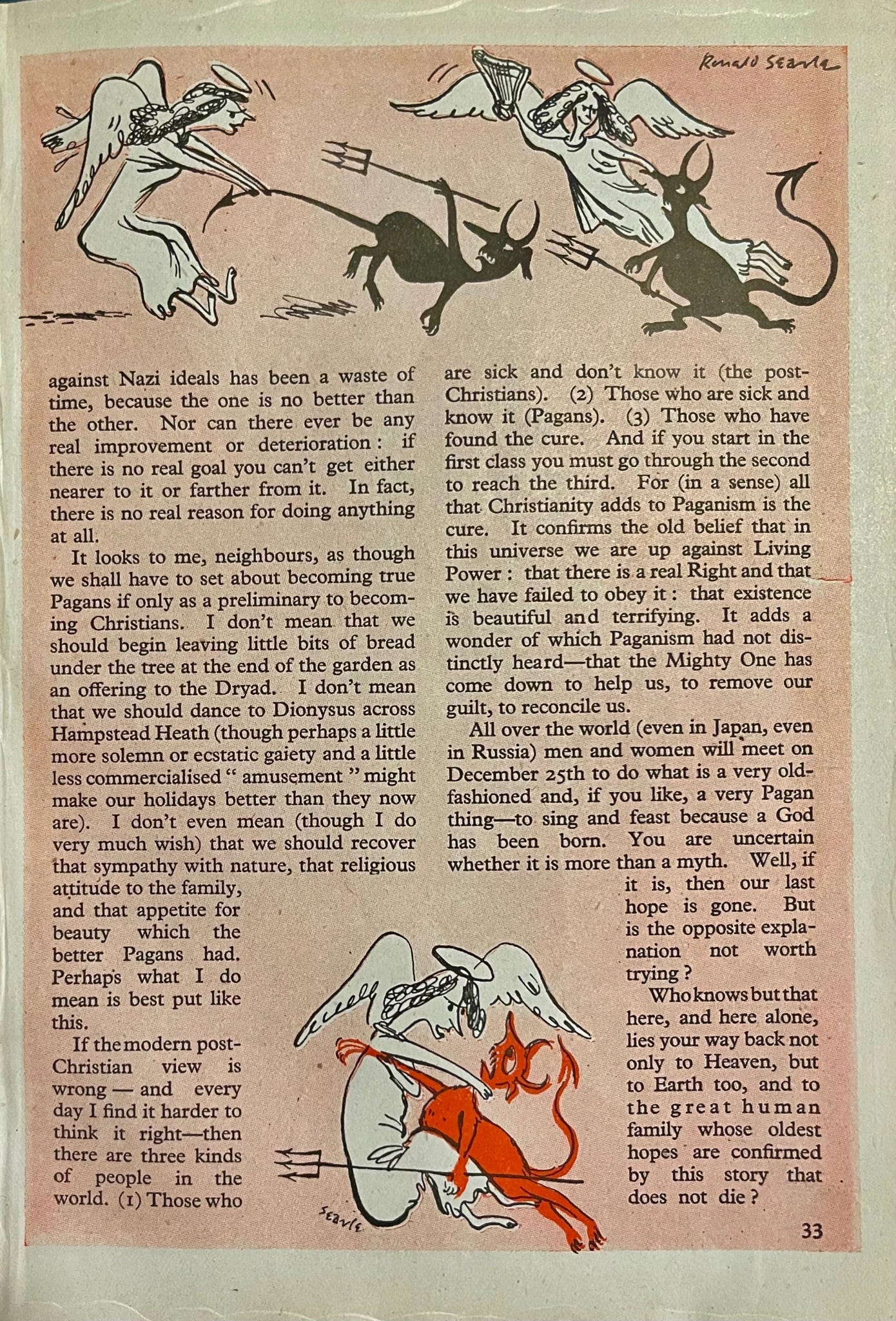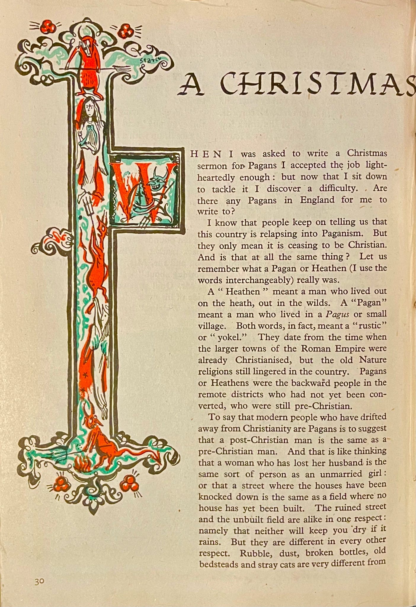“When I was asked to write a Christmas sermon for pagans, I accepted the job light-heartedly enough, but now that I sit down to tackle it, I discover a difficulty: are there any pagans in England for me to write to? I know that people keep on telling us that this country is relapsing into paganism; but they only mean that it is ceasing to be Christian, and is that at all the same thing?